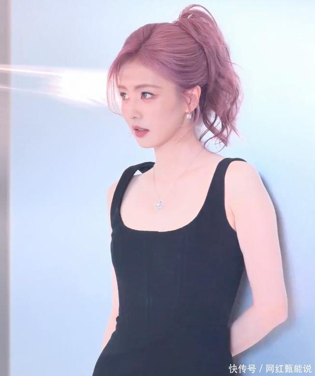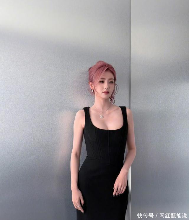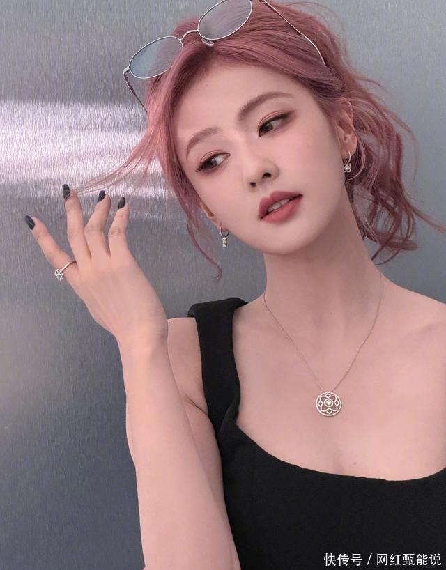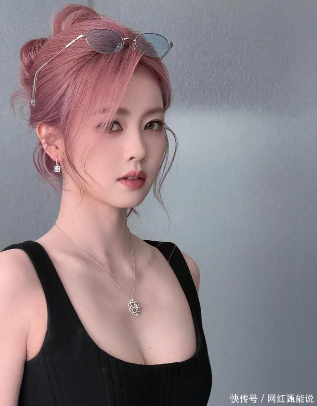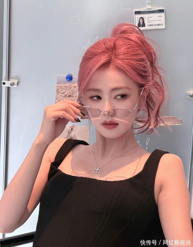 白鹿 白鹿全新染制的樱花粉色盘发高马尾,搭配无框/银框眼镜,形成“高智感女教授”风格。
