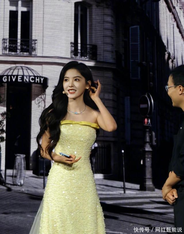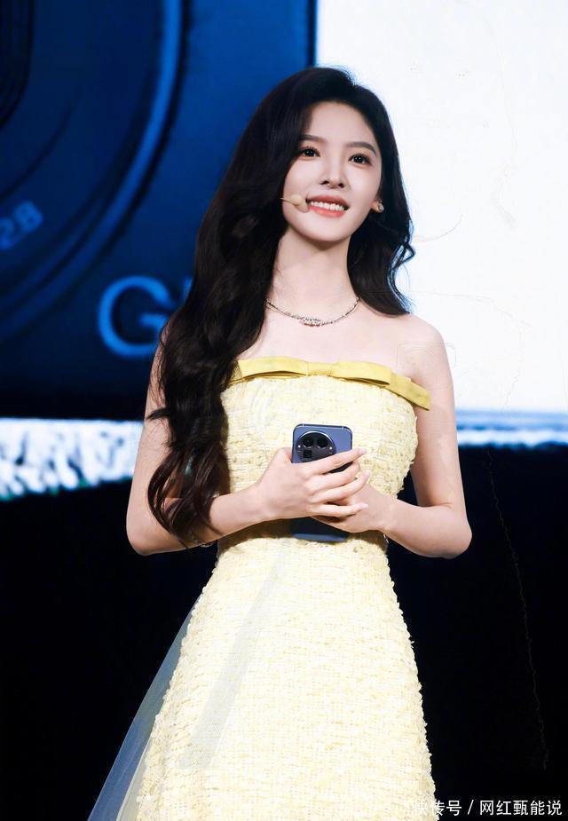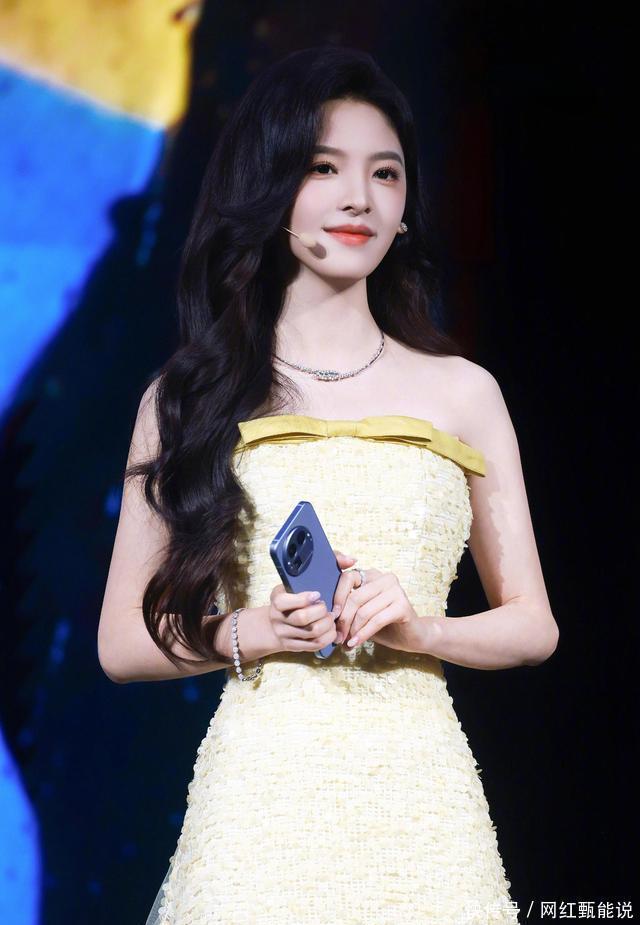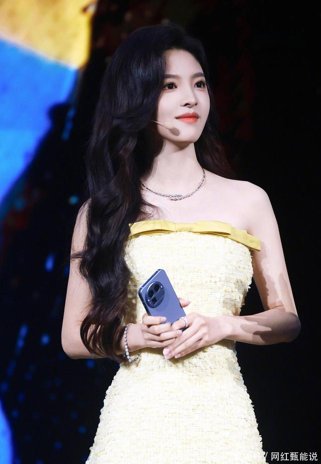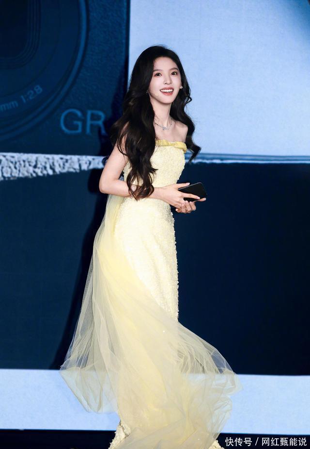 章若楠鹅黄色抹胸礼裙 章若楠身穿鹅黄色抹胸礼裙,高腰线搭配拖尾纱裙,行走时裙摆轻盈如“春日发光体”,增强视觉纵深感,简约金色耳饰或珍珠元素点缀,搭配自然垂落的大波浪卷发,强化复古优雅氛围。